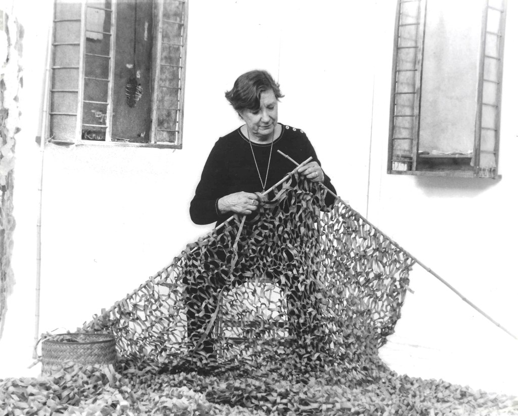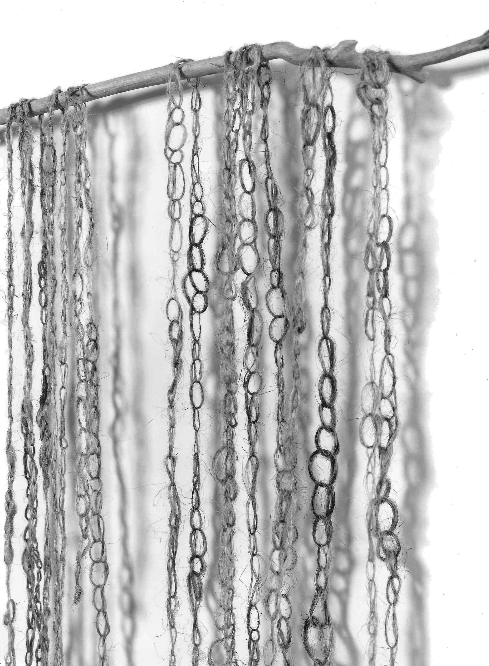 “For Widenor the appeal of working with cloth was the patterns, which is what led her to knitting. ‘I’m able to take an idea in my head and transform it into a three-dimensional thing. People make up their own stories about the work…. [But] you get the idea and then the materials take over and it isn’t that you’re thinking the whole time about the idea. You become enamored of your materials.’ Her first solo show, at the Nassau County Museum of Art in Roslyn, was a springboard. Her statement from the exhibit focuses on the literal thread she’s weaving even today. ‘A length of linen cloth from a Pharaoh’s tomb, the linen bed sheets of my great-grandmother, a sheet of tough, translucent flax paper made in a New York City loft and a curtain of hand-spun flax string are all related. They come directly from organic materials. The picture formed in the mind’s eye gradually becomes a place, an enterable sculpture, a tent, a shelter, a hollow tree or cupboard. The installations emerge…from a yearning for safety and calm. The world is not safe or calm anymore.'”