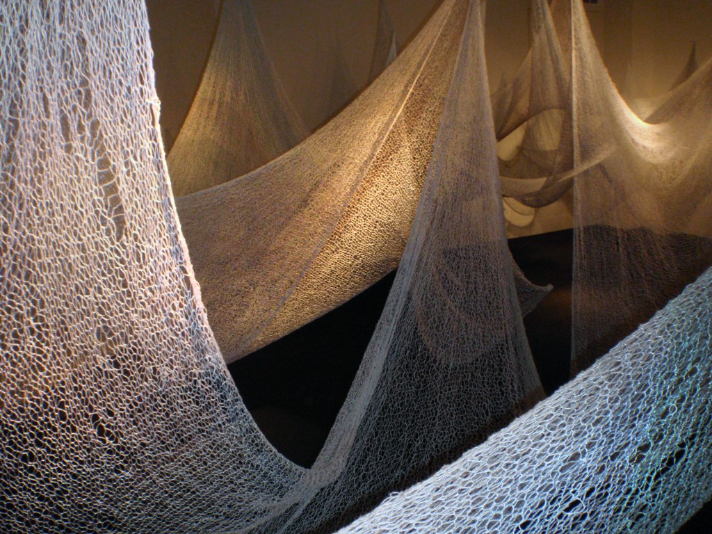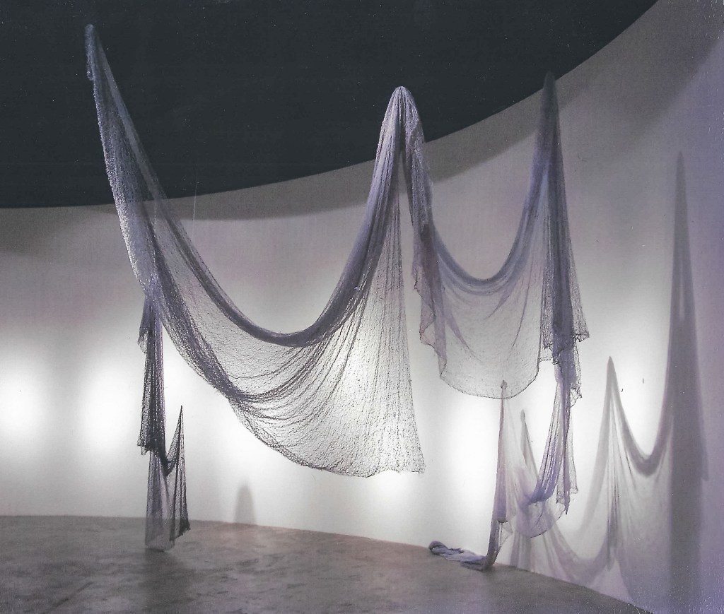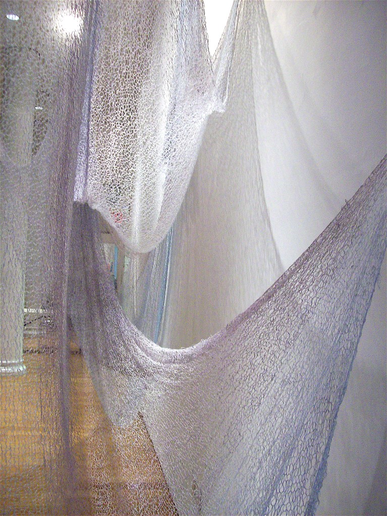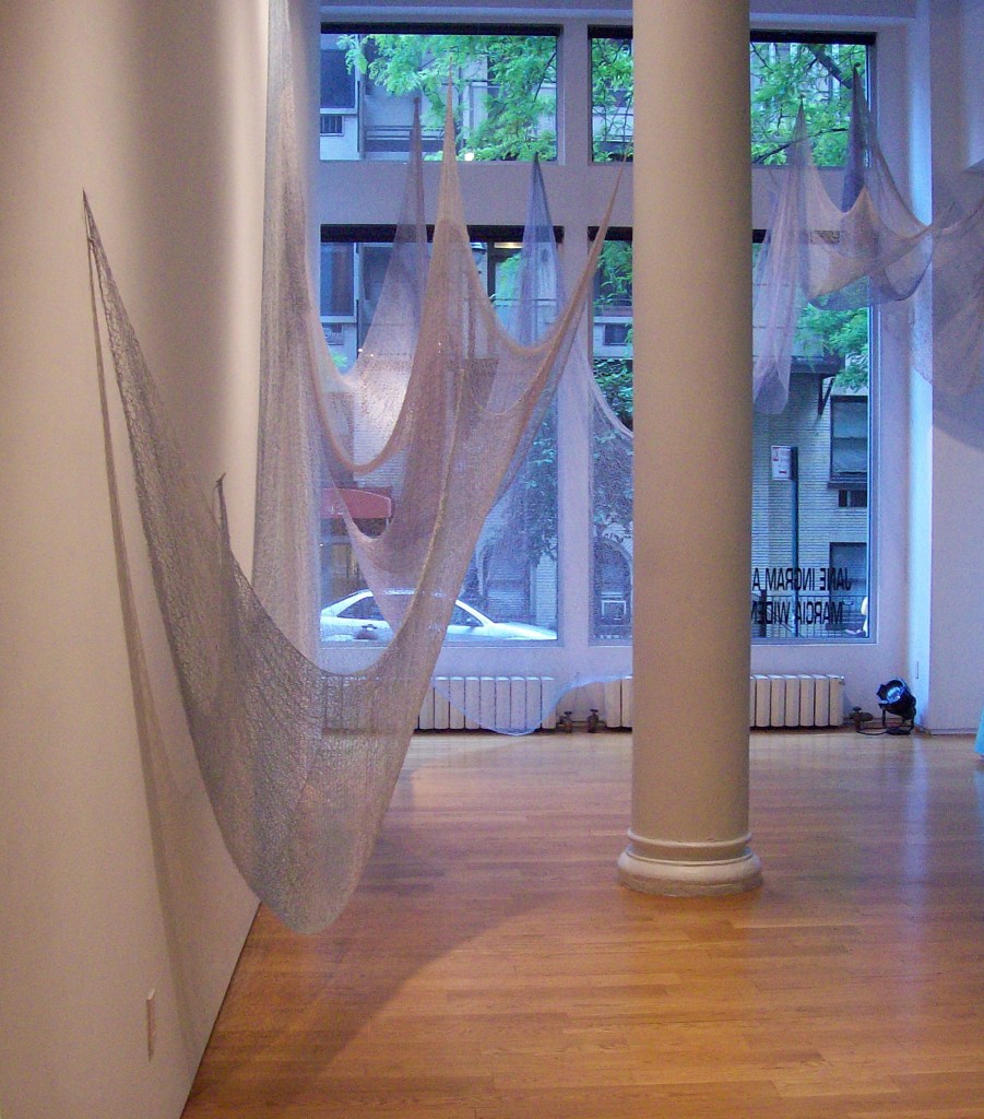 “Marcia Widenor’s… works evince their interest in the future of our planet. This show’s title Still Waters… implies myriad meanings but very importantly engages with the subject of catastrophic events concerning water or its absence. Widenor deals with tsunami or seismic waves that have recently devastated parts of the world. Her delicate wavelike membranes hang from the gallery ceilings that emulate the undulating nature of ocean waves. Yet, her woven lacelike forms belie the idea of disaster in their extreme fragility. Her installation After the Tsunami… consists of loosely knitted hand-dyed linen threads forming veils that confront the viewer as much as envelop him into their midst. Because Widenor’s installations are loosely woven, they are transparent and light and can move with the atmosphere’s air currents. As much as they are reminiscent of ocean waves, they can also be read in terms of protective shelters or as hollow forms reminiscent of forts, tree houses, and other childhood hideouts where precious objects were stashed.