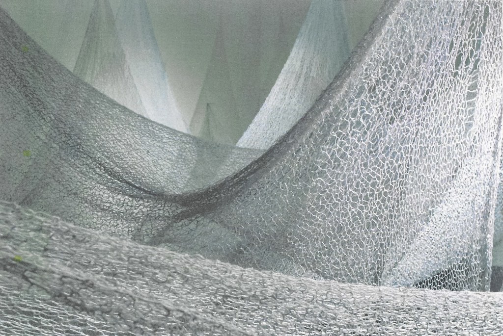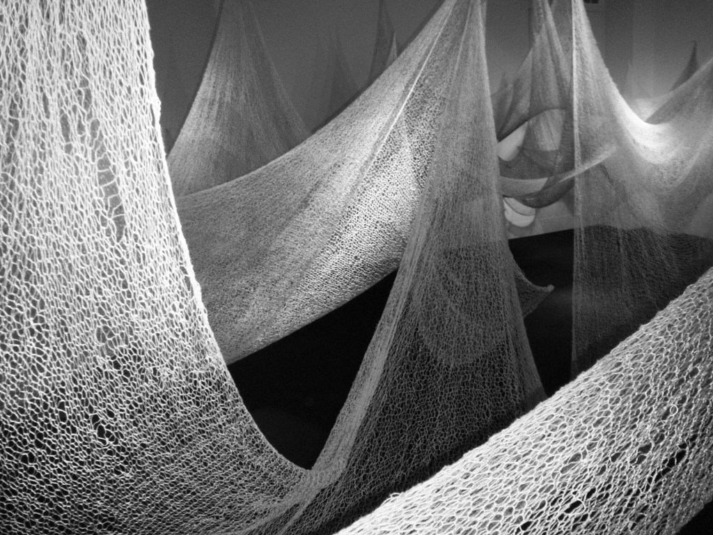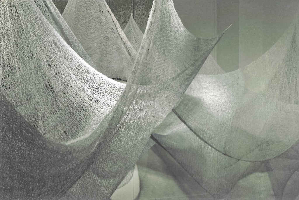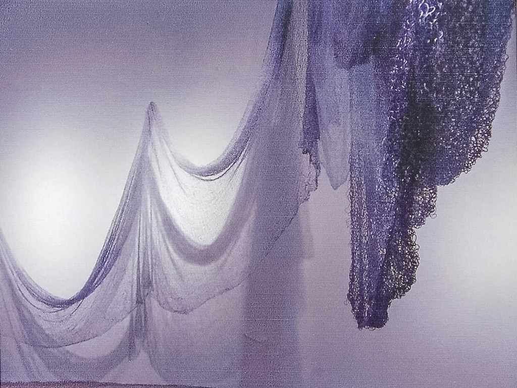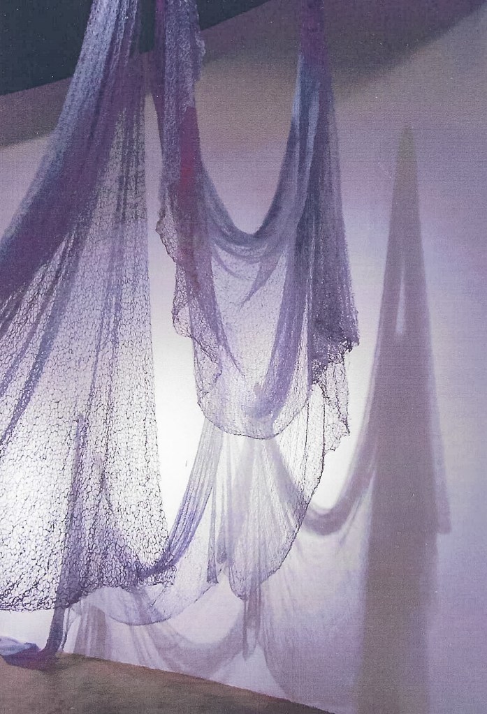 “Marcia Widenor’s… works evince their interest in the future of our planet. This show’s title Still Waters… implies myriad meanings but very importantly engages with the subject of catastrophic events concerning water or its absence. Widenor deals with tsunami or seismic waves that have recently devastated parts of the world. Her delicate wavelike membranes hang from the gallery ceilings that emulate the undulating nature of ocean waves. Yet, her woven lacelike forms belie the idea of disaster in their extreme fragility. Her installation After the Tsunami… consists of loosely knitted hand-dyed linen threads forming veils that confront the viewer as much as envelop him into their midst. Because Widenor’s installations are loosely woven, they are transparent and light and can move with the atmosphere’s air currents. As much as they are reminiscent of ocean waves, they can also be read in terms of protective shelters or as hollow forms reminiscent of forts, tree houses, and other childhood hideouts where precious objects were stashed.