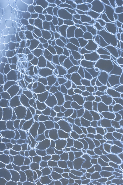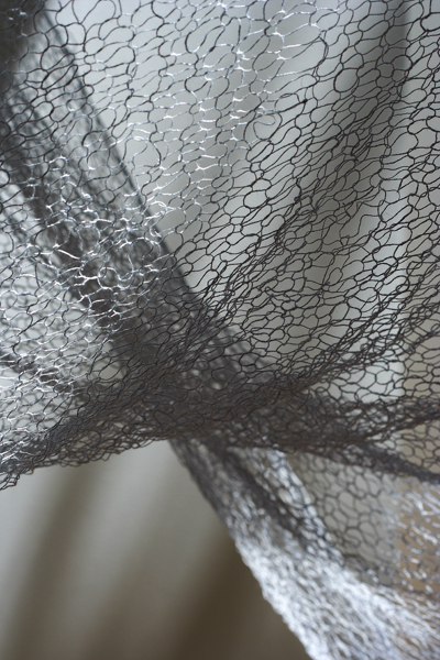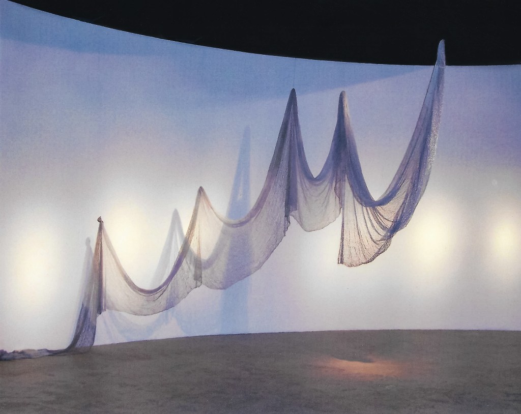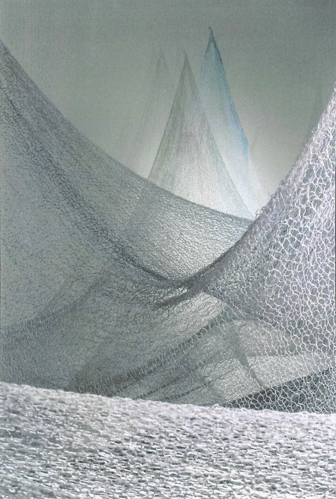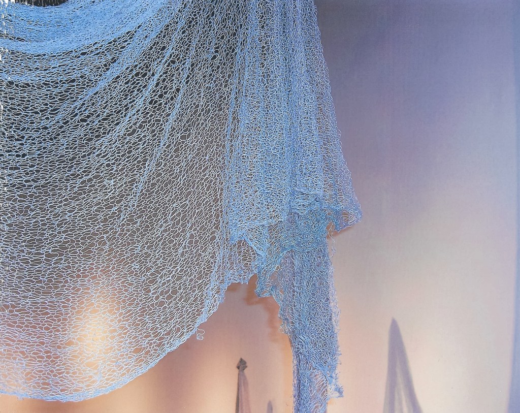 “One day after the tsunami swept across Indonesia at the end of 2004, I cast 200 stitches of pale blue linen thread onto large bamboo knitting needles and began to try and knit a wave. My material was thin white line flax dyed in a large pot in my kitchen. As I used up one batch of thread, I dyed more. The color changed from blue to gray, and lavender, then greener, then back to blue. I knitted almost every day as news of the disaster and slow recovery reached the outside world. By the anniversary of the wave, the fragile net was over sixty feet long, but weighted less than four pounds. Hung from the ceiling it cast wavelike shadows. The ocean had shown its power and was quiet again; the project was done.”