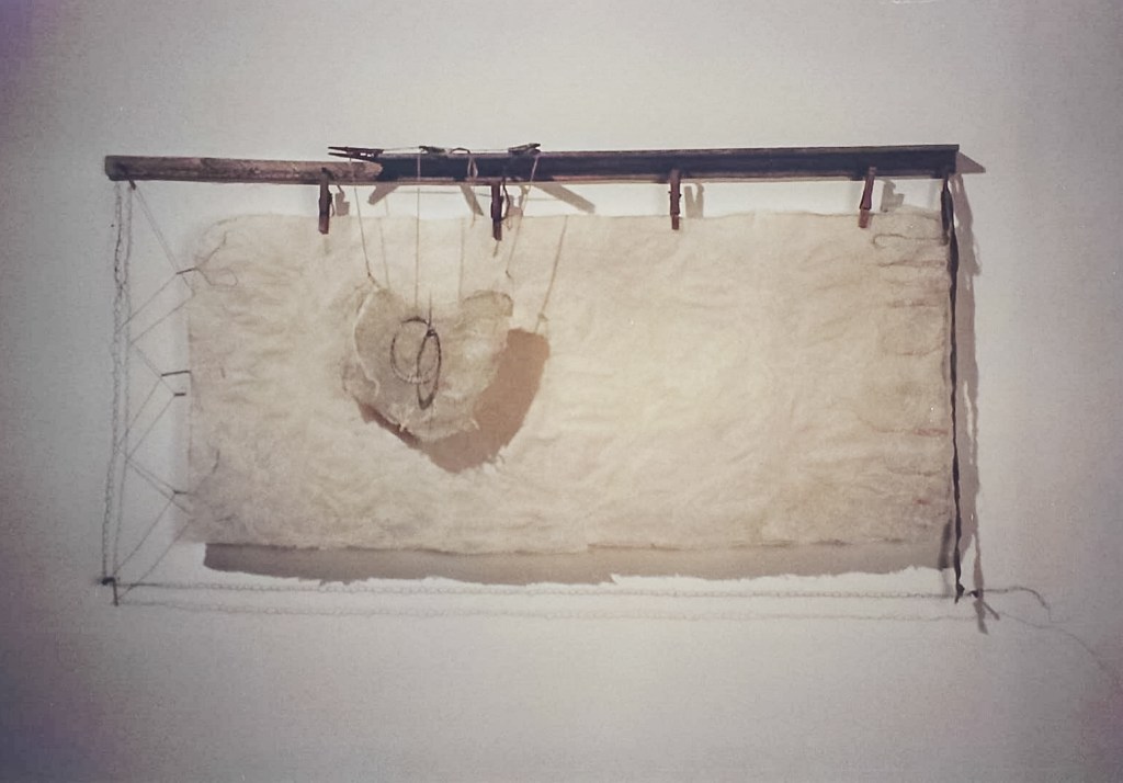 Grey Heron Rise, 1990 Handmade flax paper, wood, string, wire, wooden clothes pins and nails28 x 42 x 3 in.