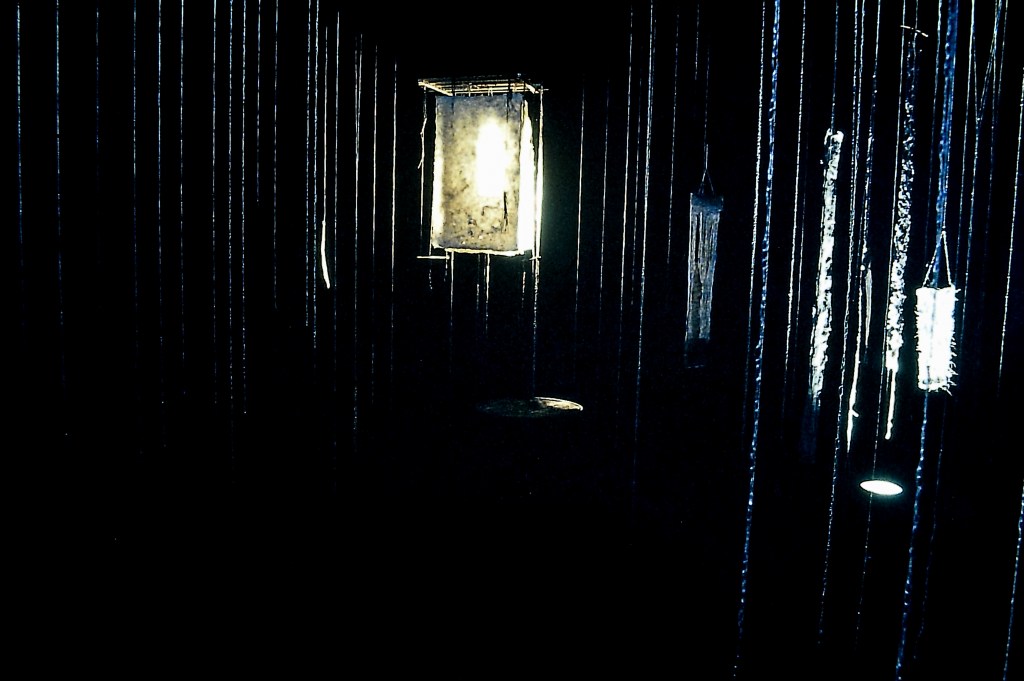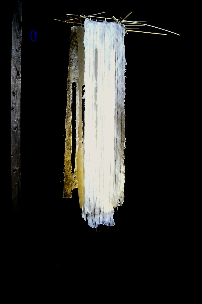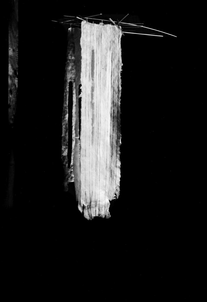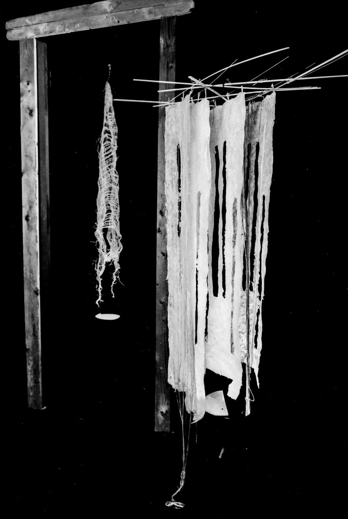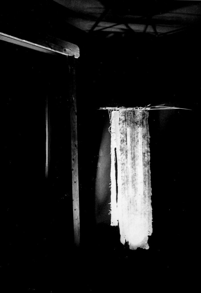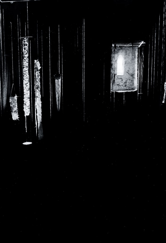 “This sculptural installation, called Litany, was made for a small room at Queensborough Community College Museum, in Bayside, New York, in March of ‘92. The room was lined with black cloth; the structures are made from thin flax paper and white linen thread. The music is a Japanese Shakuhachi flute. The remembered litanies of our childhood, echo through our lives and sometimes comfort us, grant us a safe lodging.”
