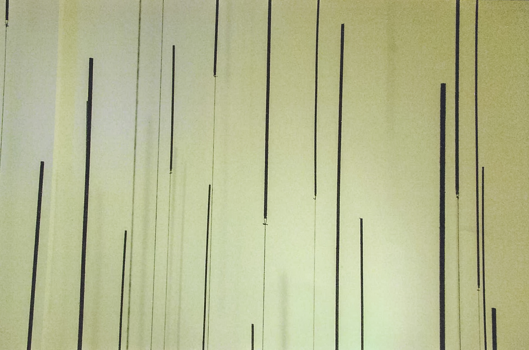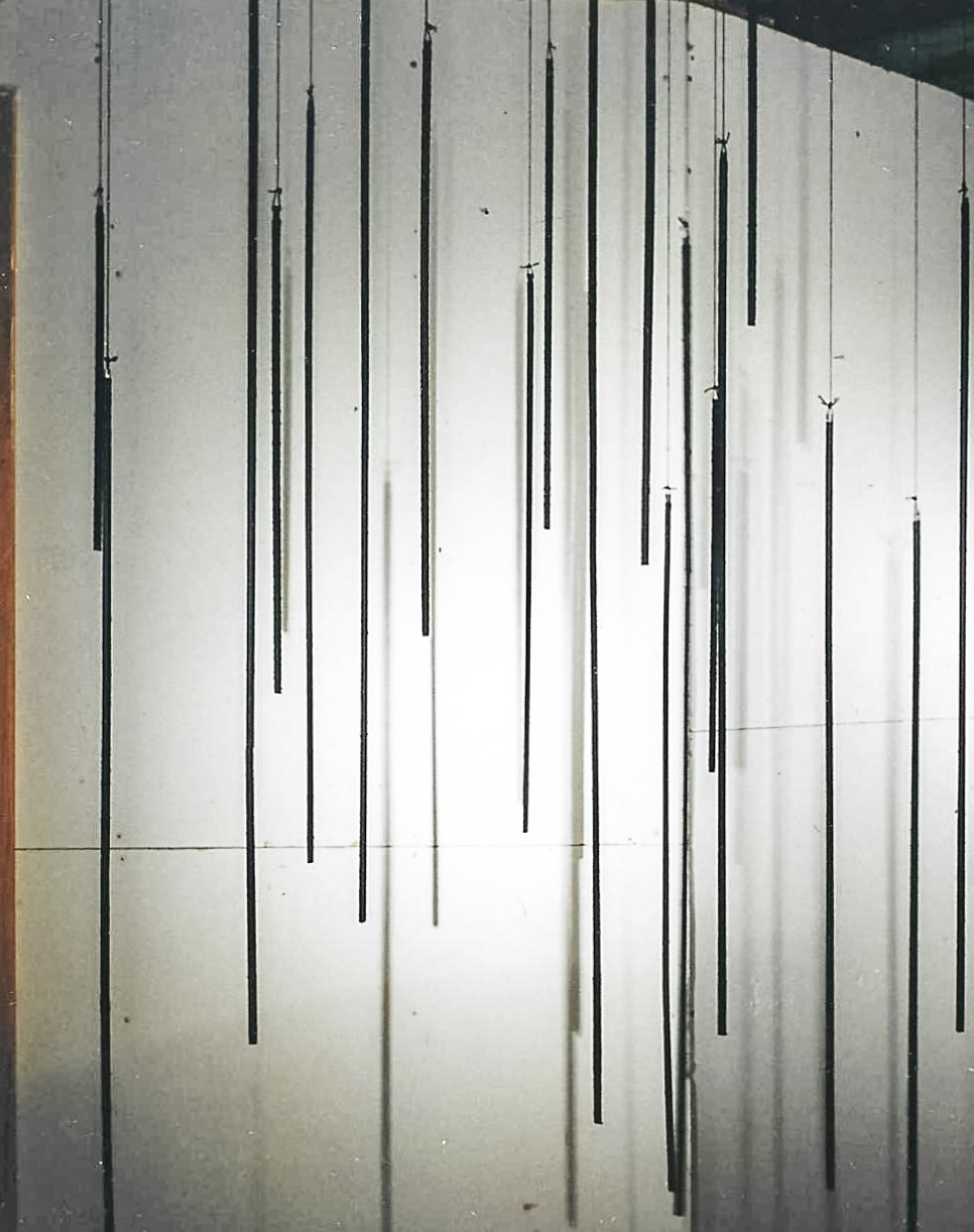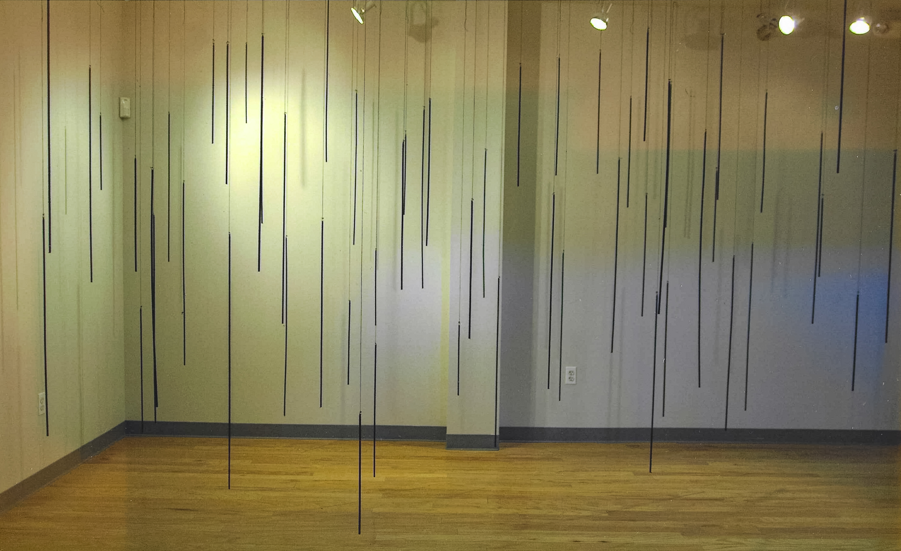 “”Marking Space” is… a group of hangings, but her [Widenor’s] elements are linear rather than flat. She has wrapped wood dowels with linen thread and suspended them from the ceiling, so the viewers may walk around and into the area they define. To me, the result is a kind of spatial drawing using an infinitely variable configuration of marks. It also has a sinister overtone, suggesting a dark rain, burdened with soot, streaking downward.” – Helen A. Harrison, The New York Times, January 22, 2006