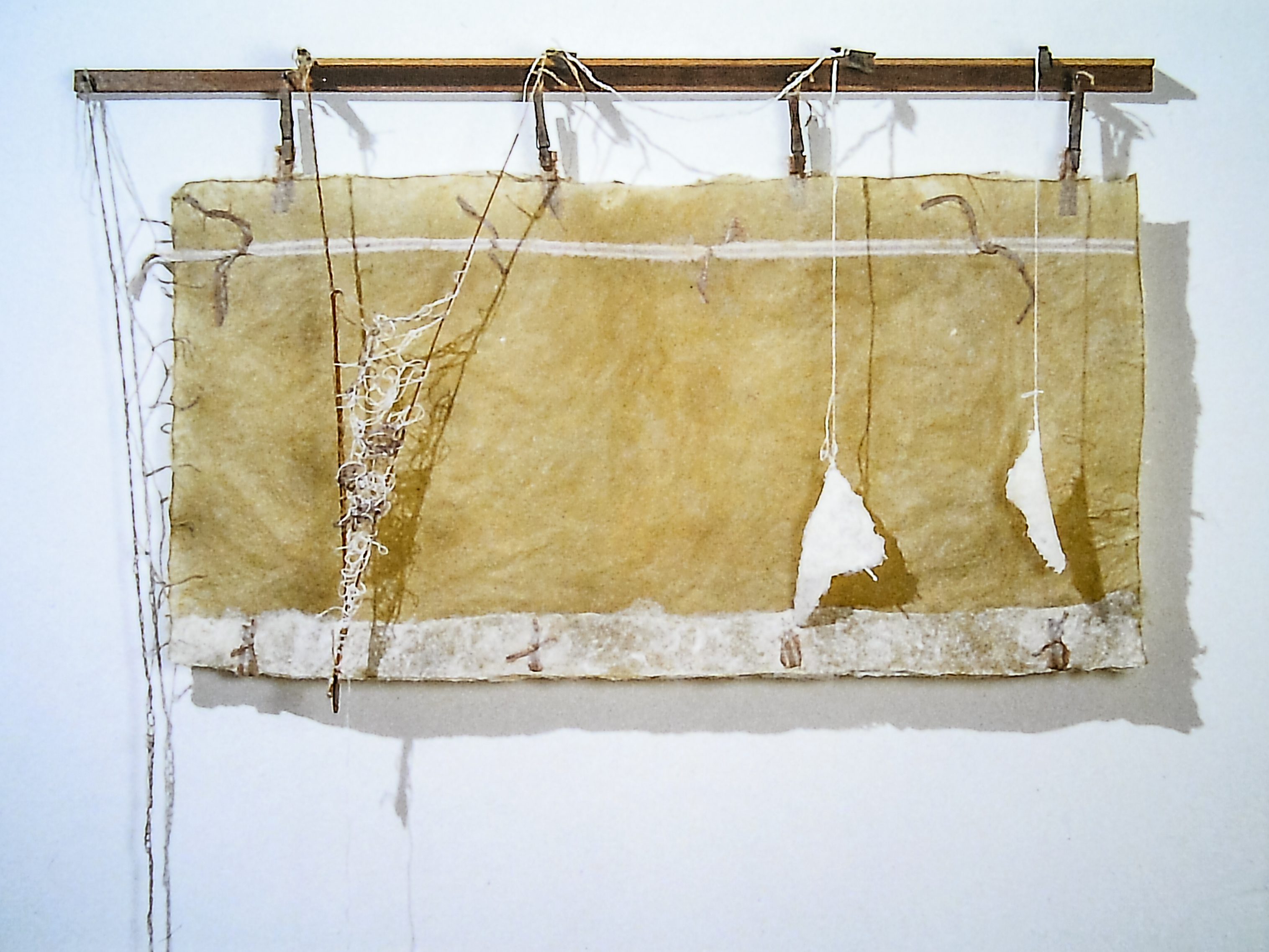Handmade flax paper, string, reeds, wood, cloth, wooden clothes pins