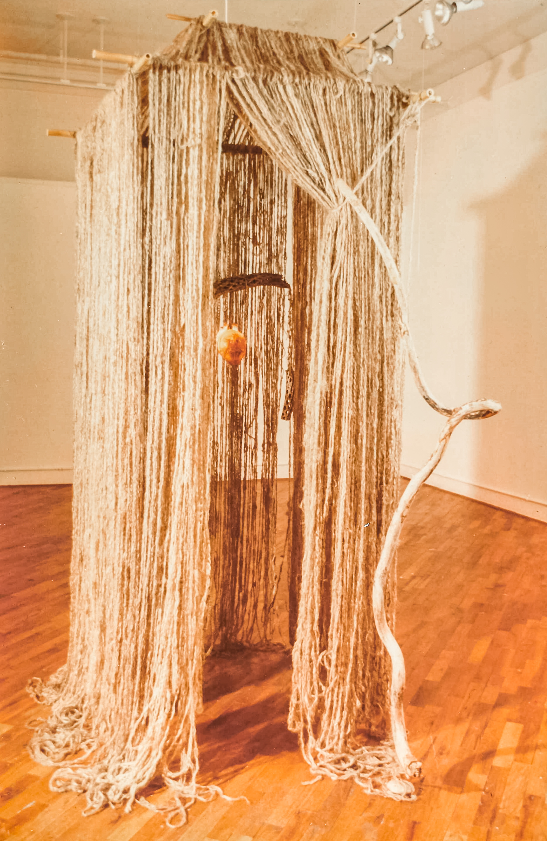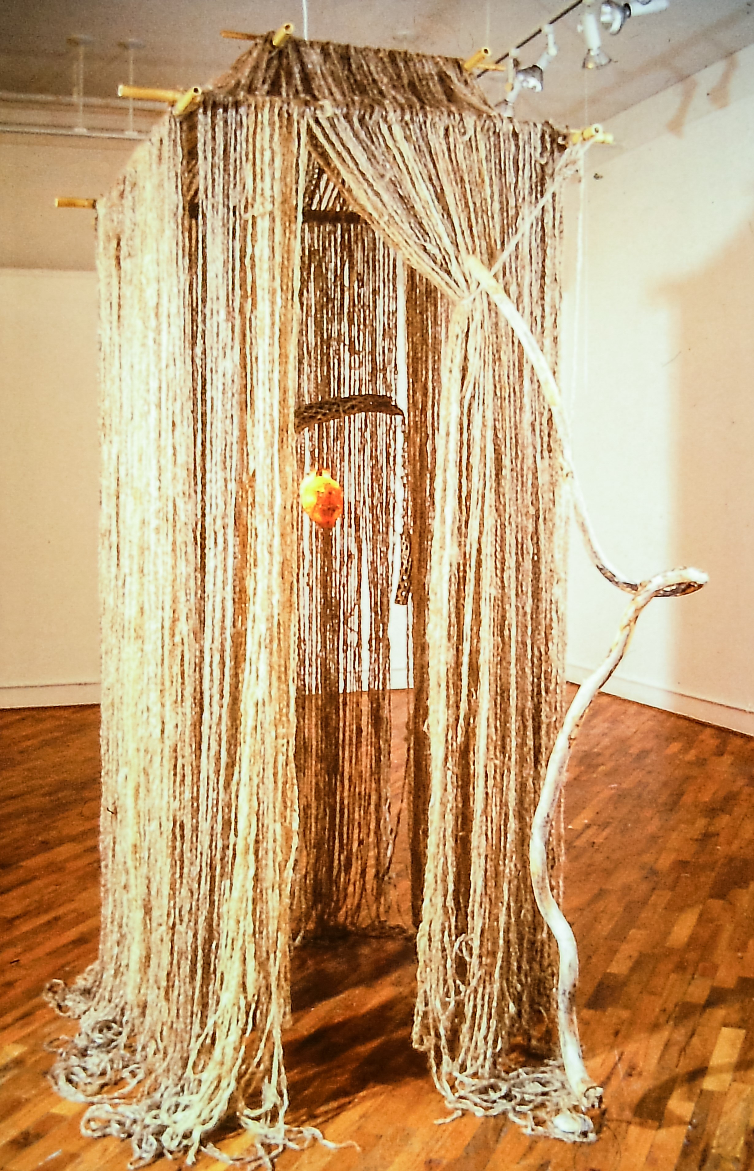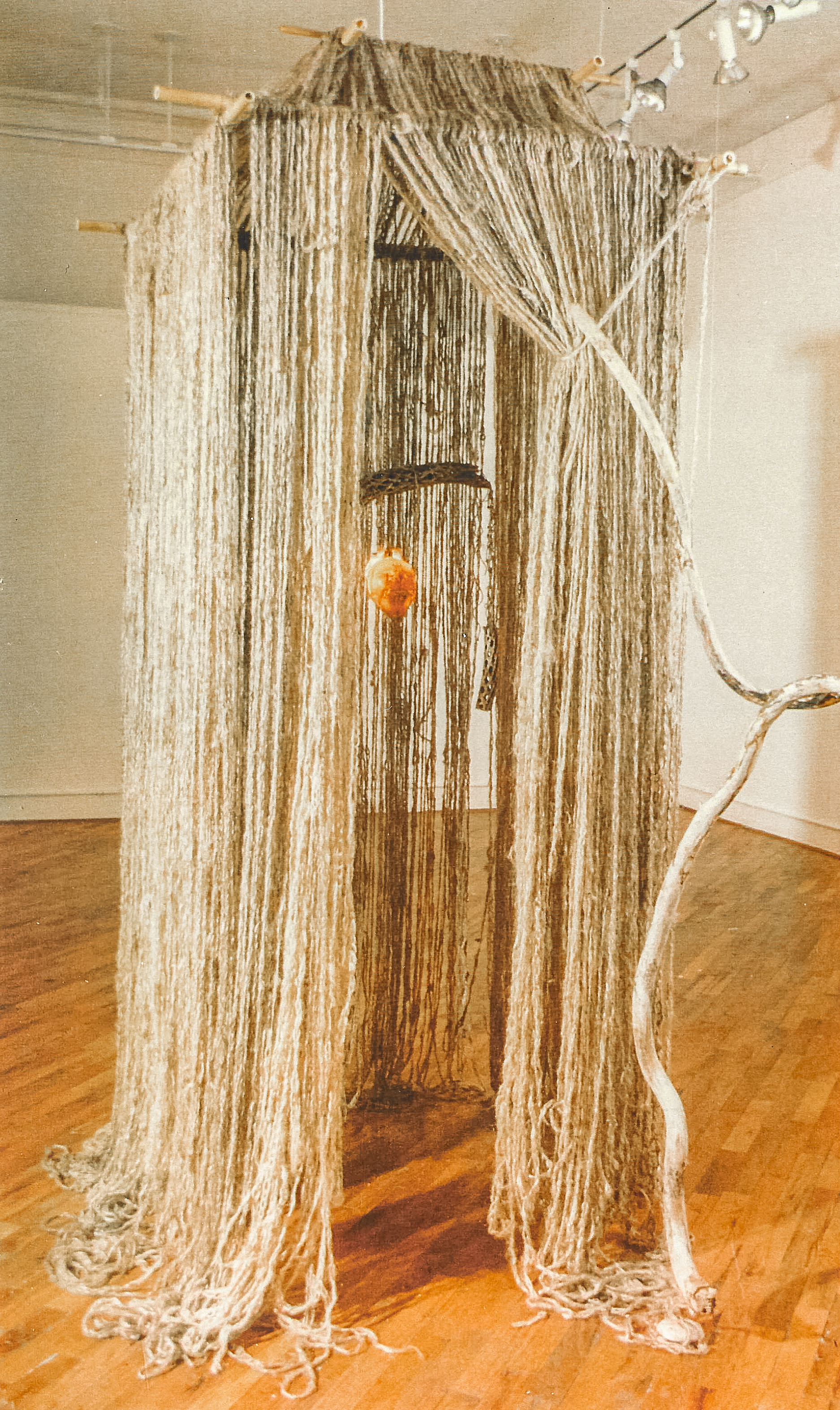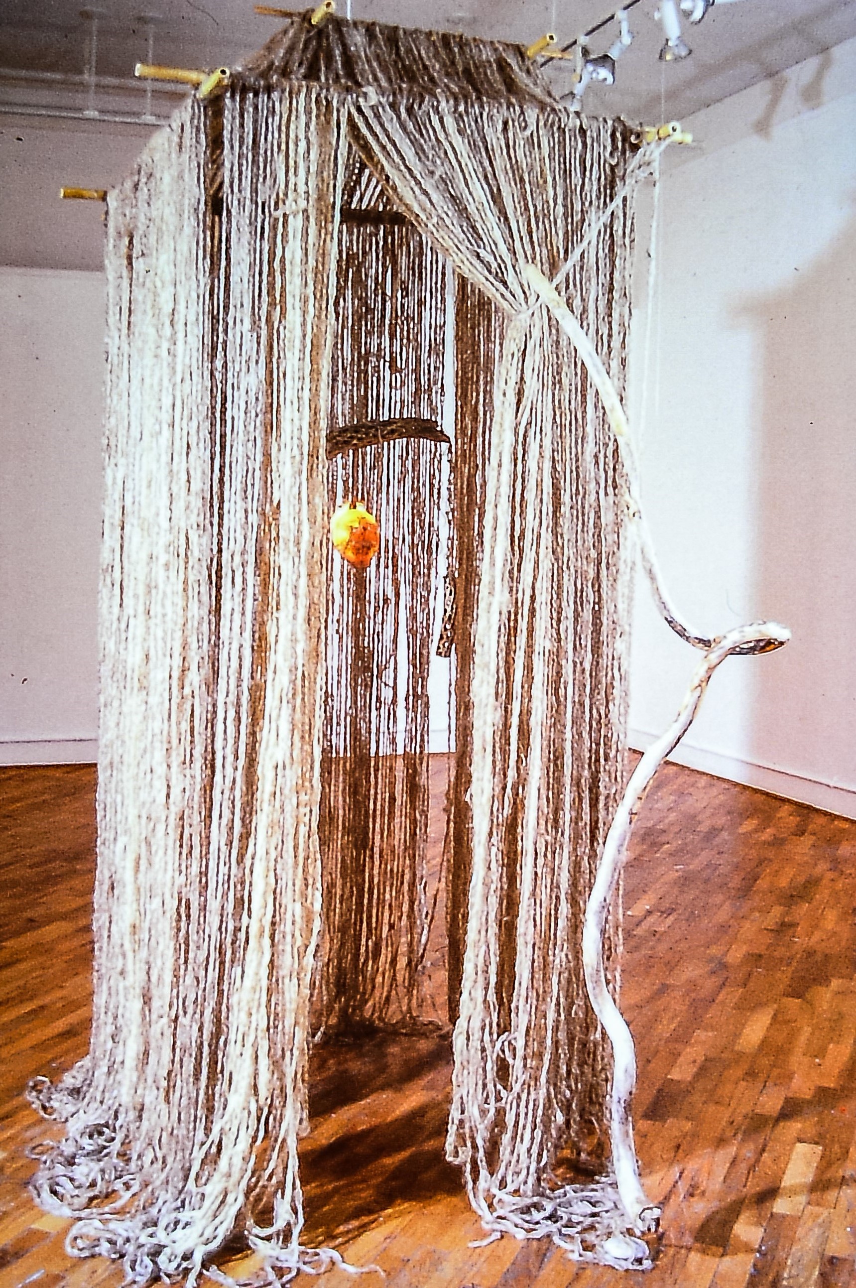 “Flax is an ancient fiber, very fine, very durable; it’s use is as old as the pyramids. When I hand-spin flax between my fingers, it is soft and translucent. This small shelter is fragile, air and light move through it. When you are inside, the space enfolds you. The process of making the hundreds of feet of crocheted flax string has been a slow meditation. Much is left for the viewer to decide.”