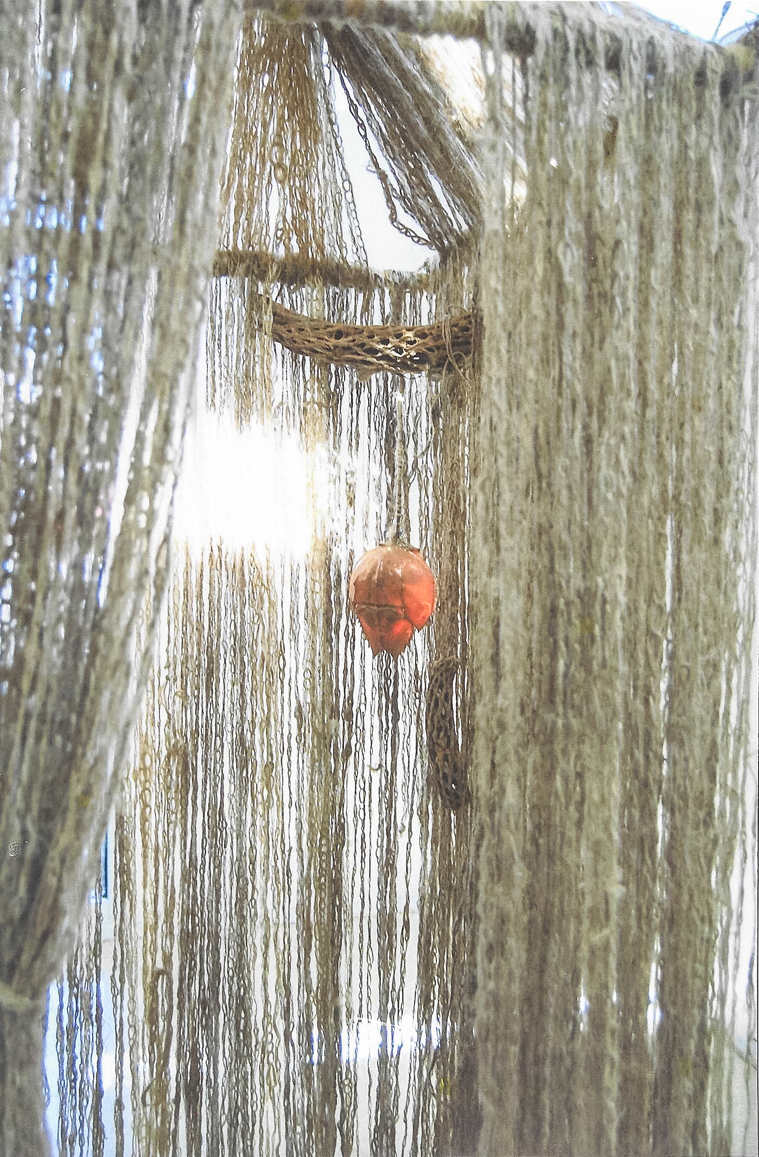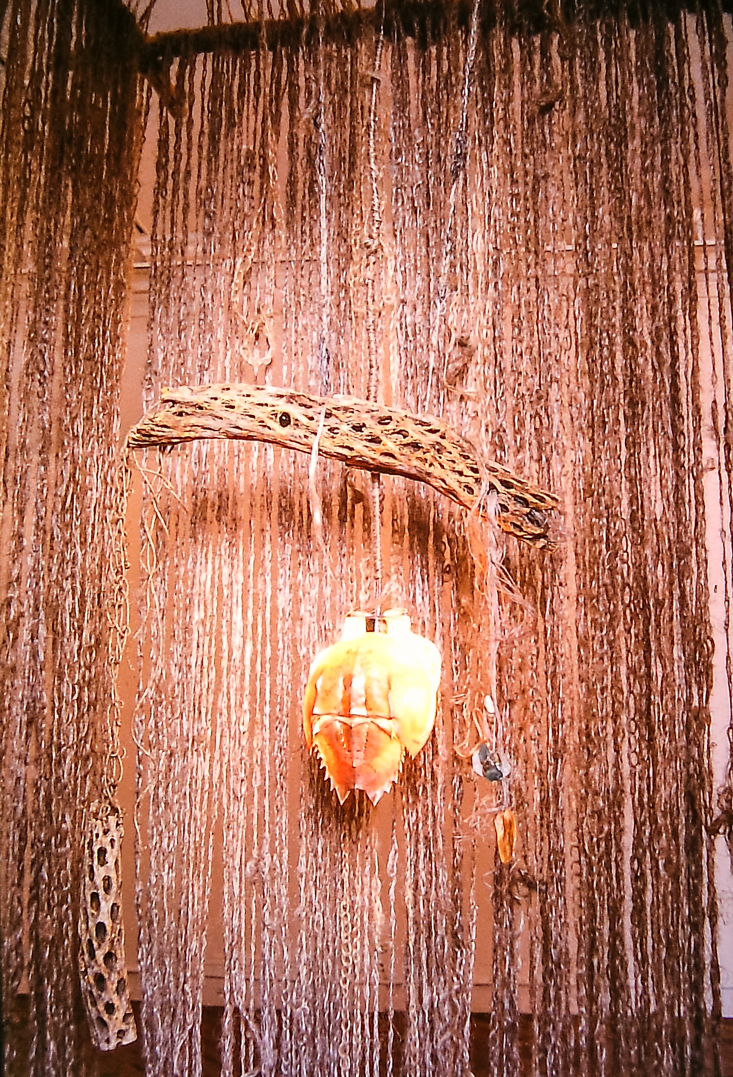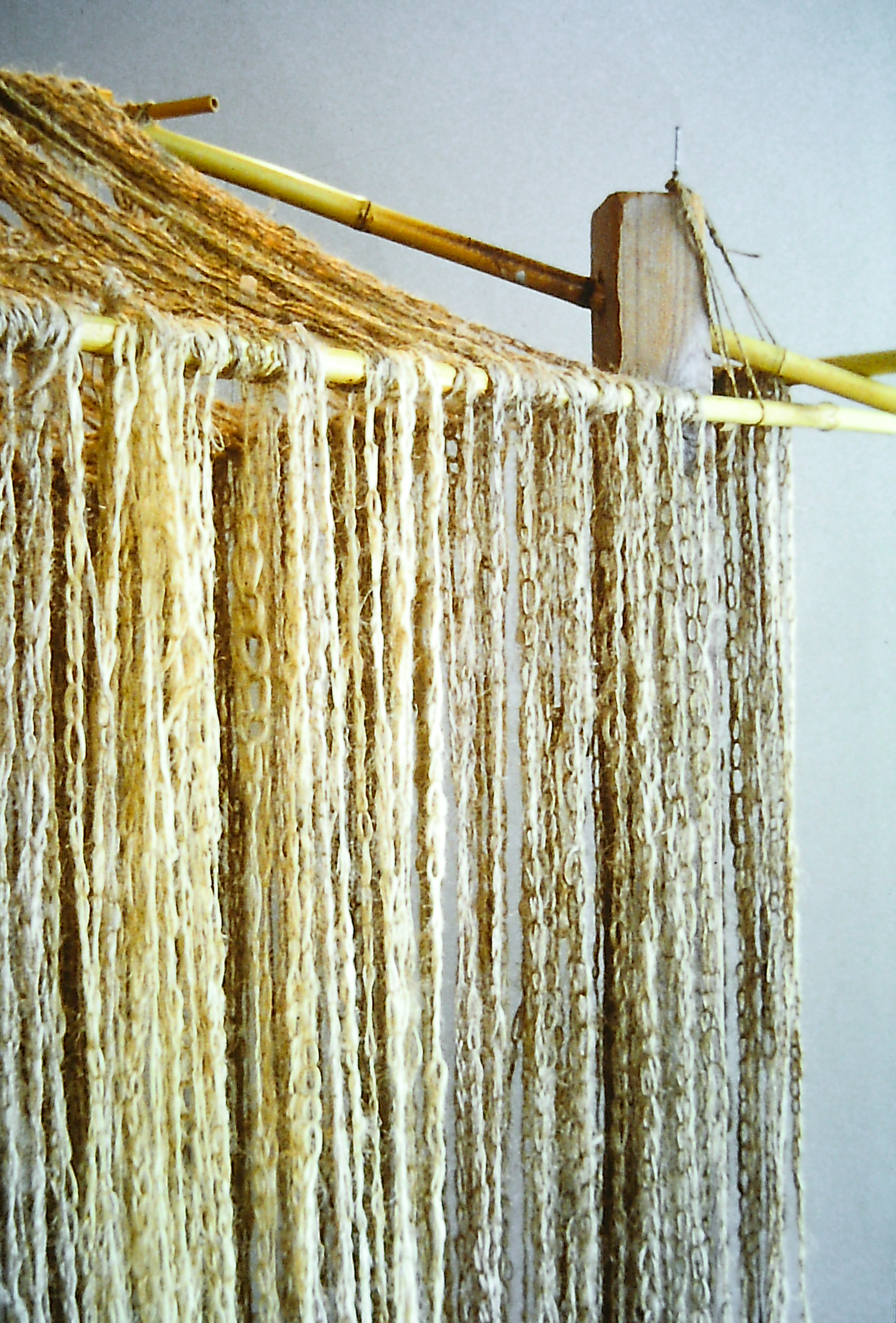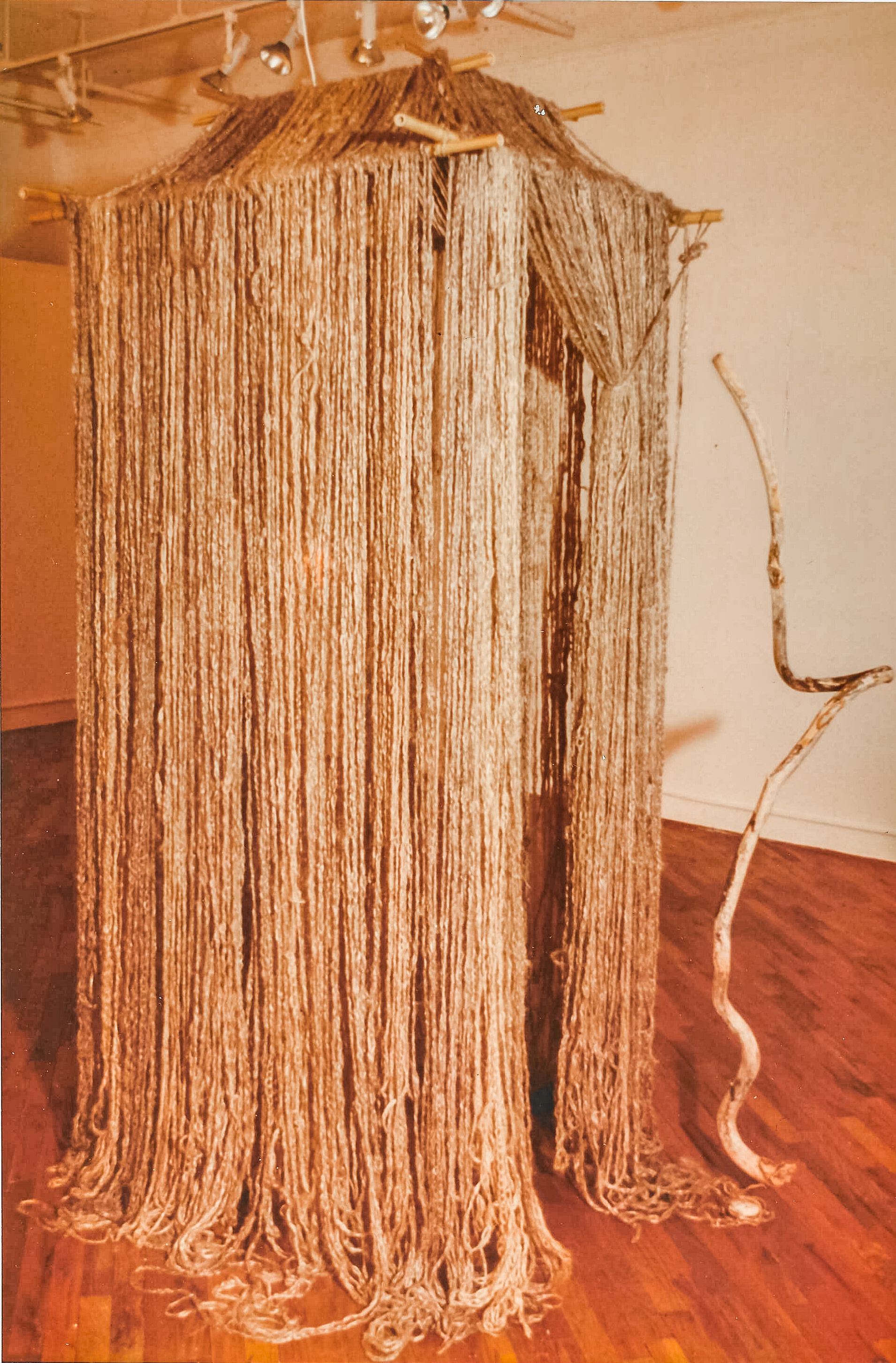 “Flax is an ancient fiber, very fine, very durable; it’s use is as old as the pyramids. When I hand-spin flax between my fingers, it is soft and translucent. This small shelter is fragile, air and light move through it. When you are inside, the space enfolds you. The process of making the hundreds of feet of crocheted flax string has been a slow meditation. Much is left for the viewer to decide.”